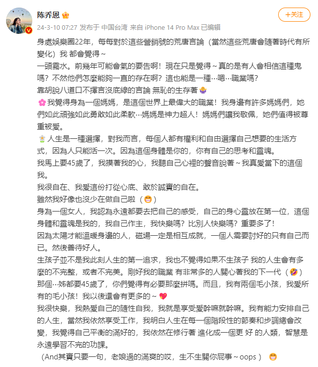 现年44岁台湾女星陈乔恩于2022年和马来西亚富二代曾伟昌(Alan)结婚,至今未有小孩,日前网上竟传出婆家急着要抱孙,若今年再不生,不排除找代孕,对此,陈乔恩发长文反击,怒呛:生不生关你屁事!