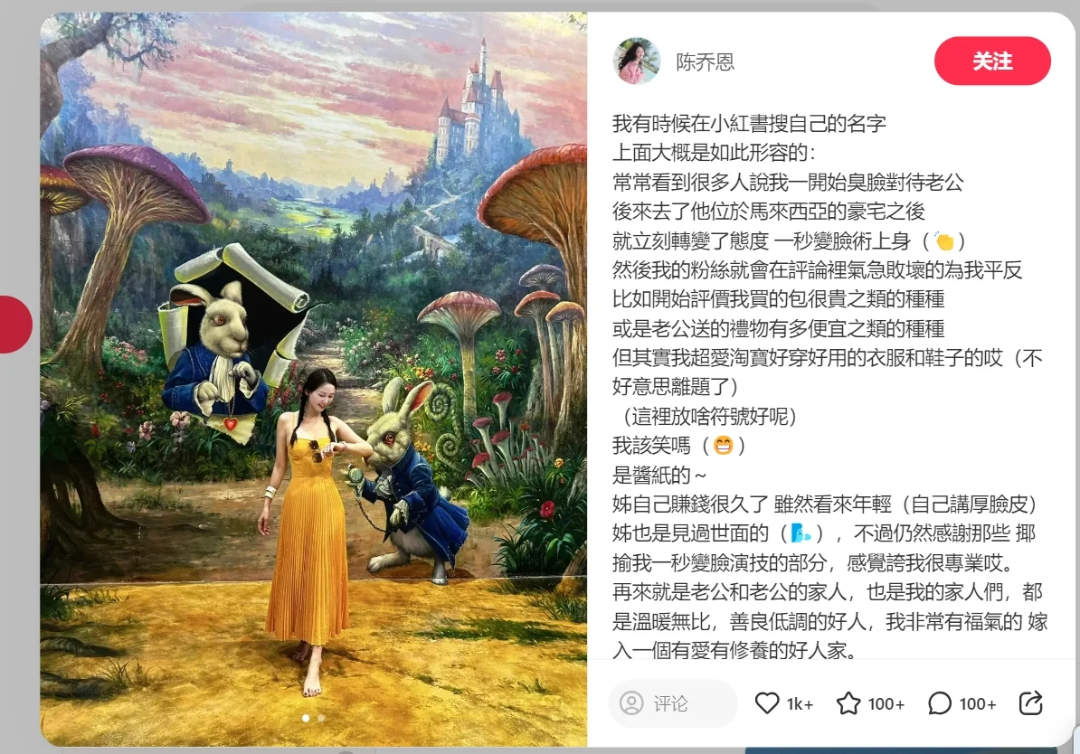 陈乔恩在社媒发文,提到搜自己的名字发现许多人认为,她最初对曾伟昌冷淡,但后来到了男方大马豪宅后就态度大变。