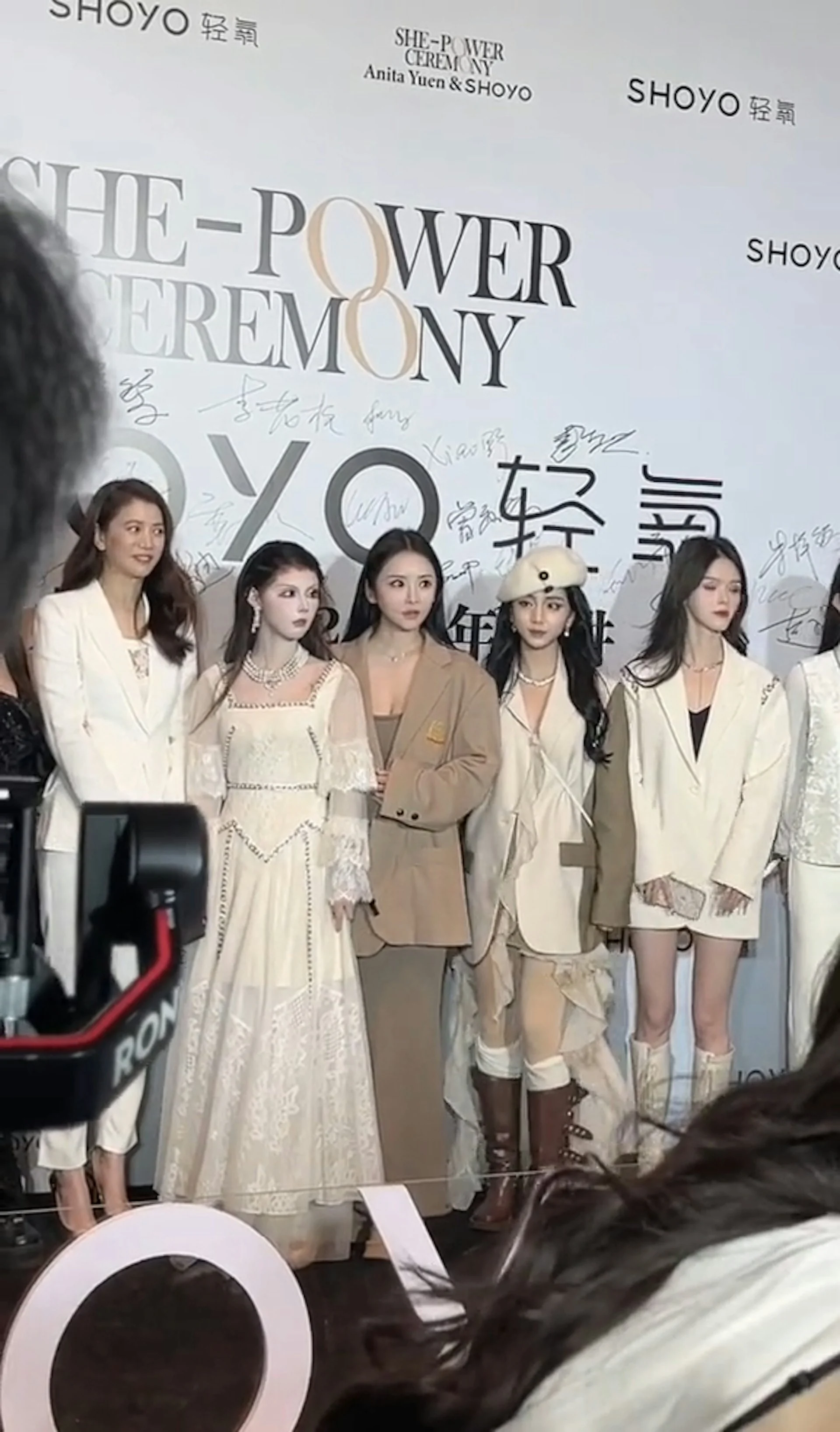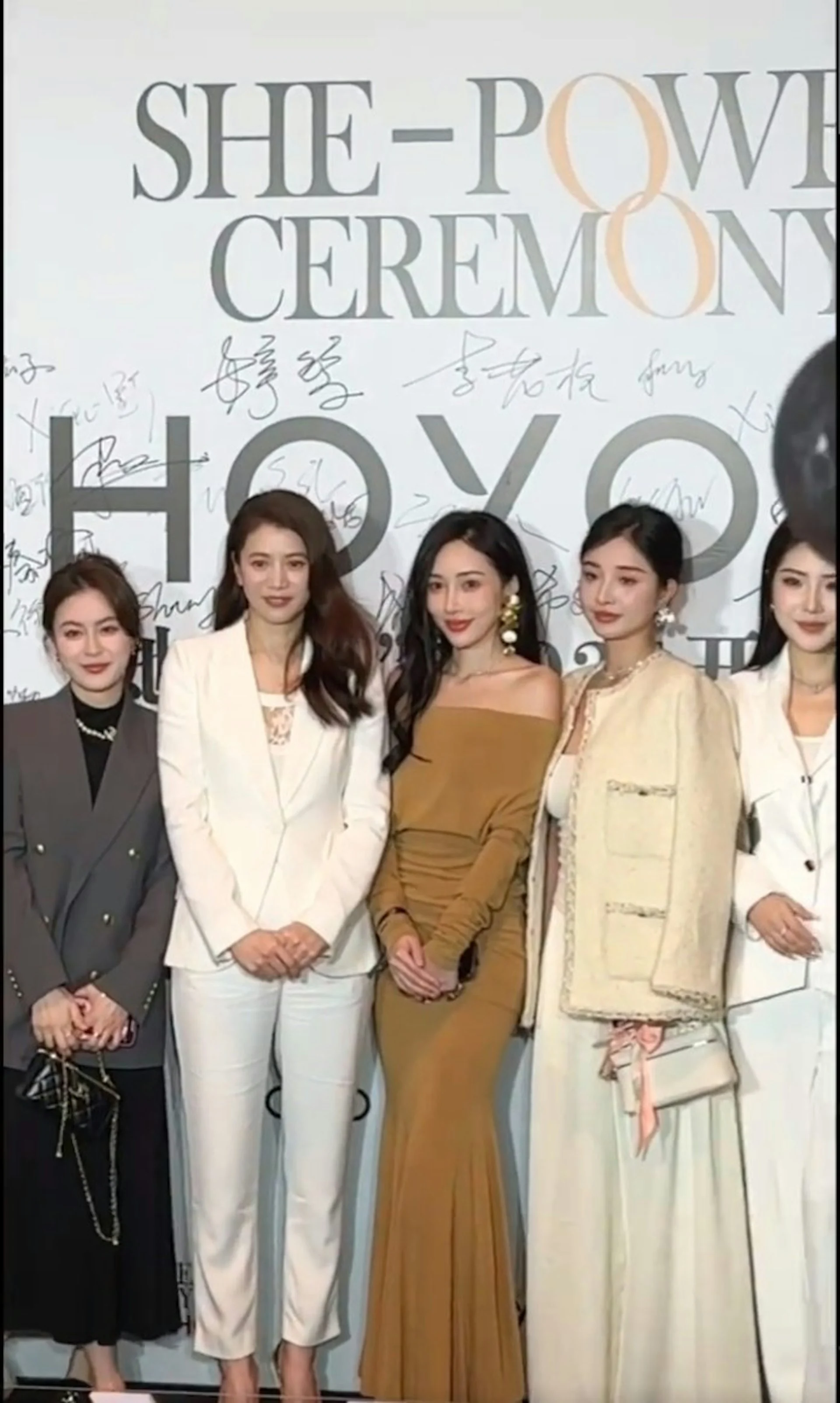 影片中,袁咏仪与一众年轻美女合影,以简约风格亮相,穿着一身全白西装,搭配金色高跟鞋,造型干练十足,无论美貌或气场都不输年轻美眉,吸引了所有目光。