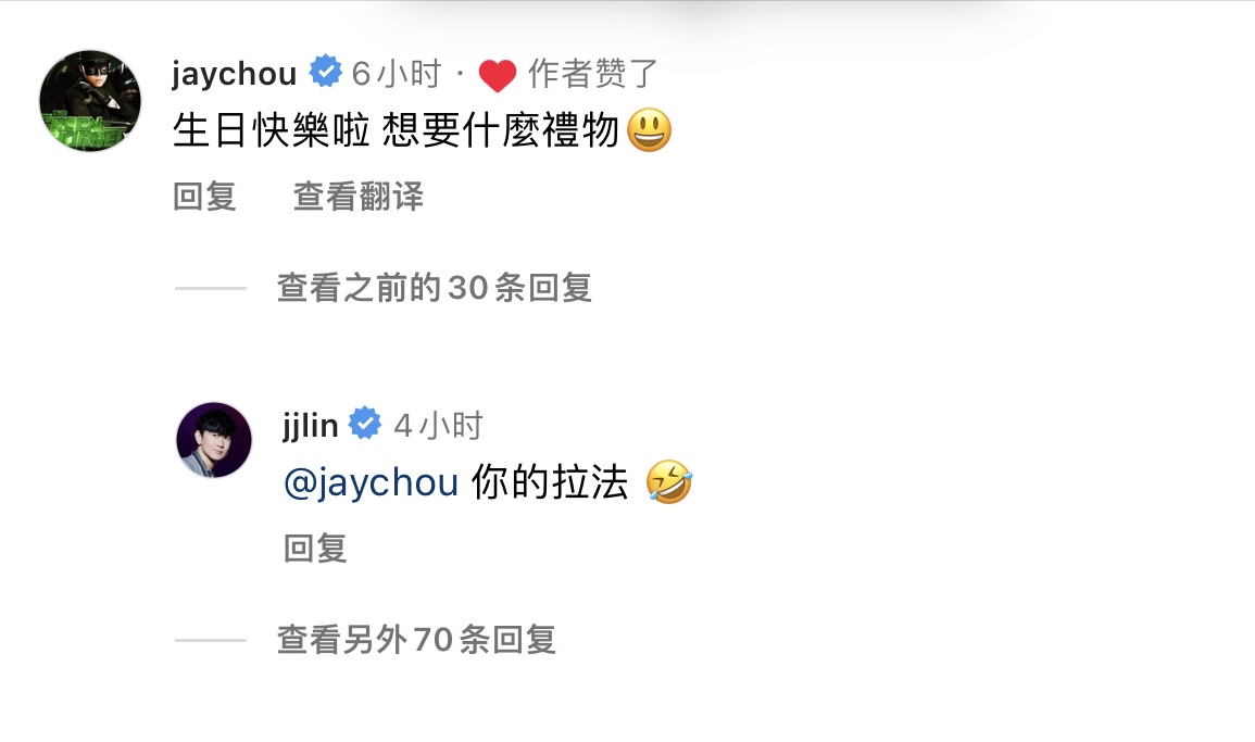 周董随后在视频下留言:“生日快乐啦!想要什么礼物?”;林俊杰随后开玩笑回应:“你的拉法(超级跑车)。”