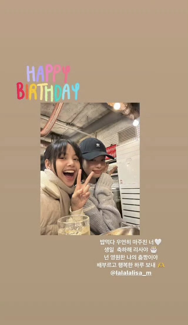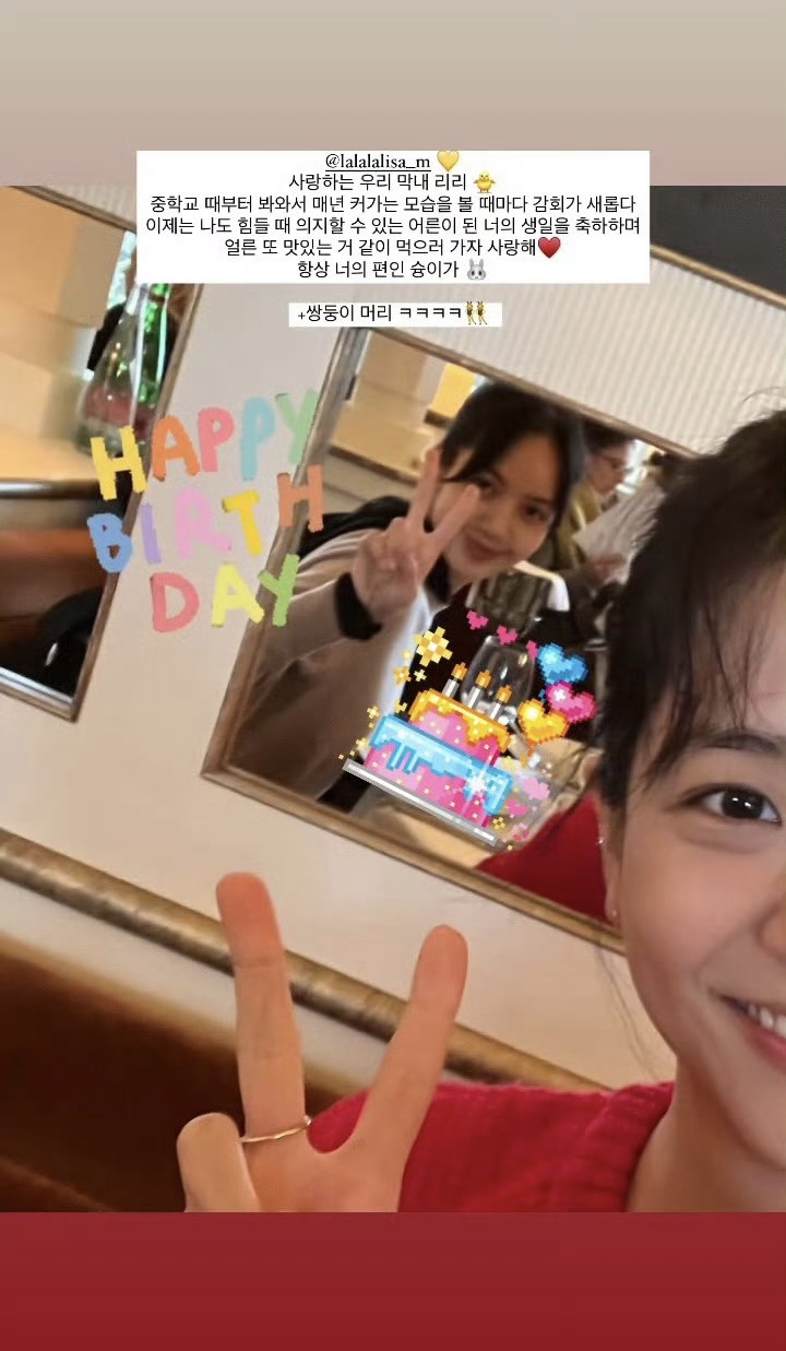 Jisoo深夜分享与Lisa的合影,配文写道:“每年看到你的成长,内心都会有很大感触,如今你也成为遇到困难时可依靠的大人了,生日快乐,希望我们能快点再一起去吃好吃的。”