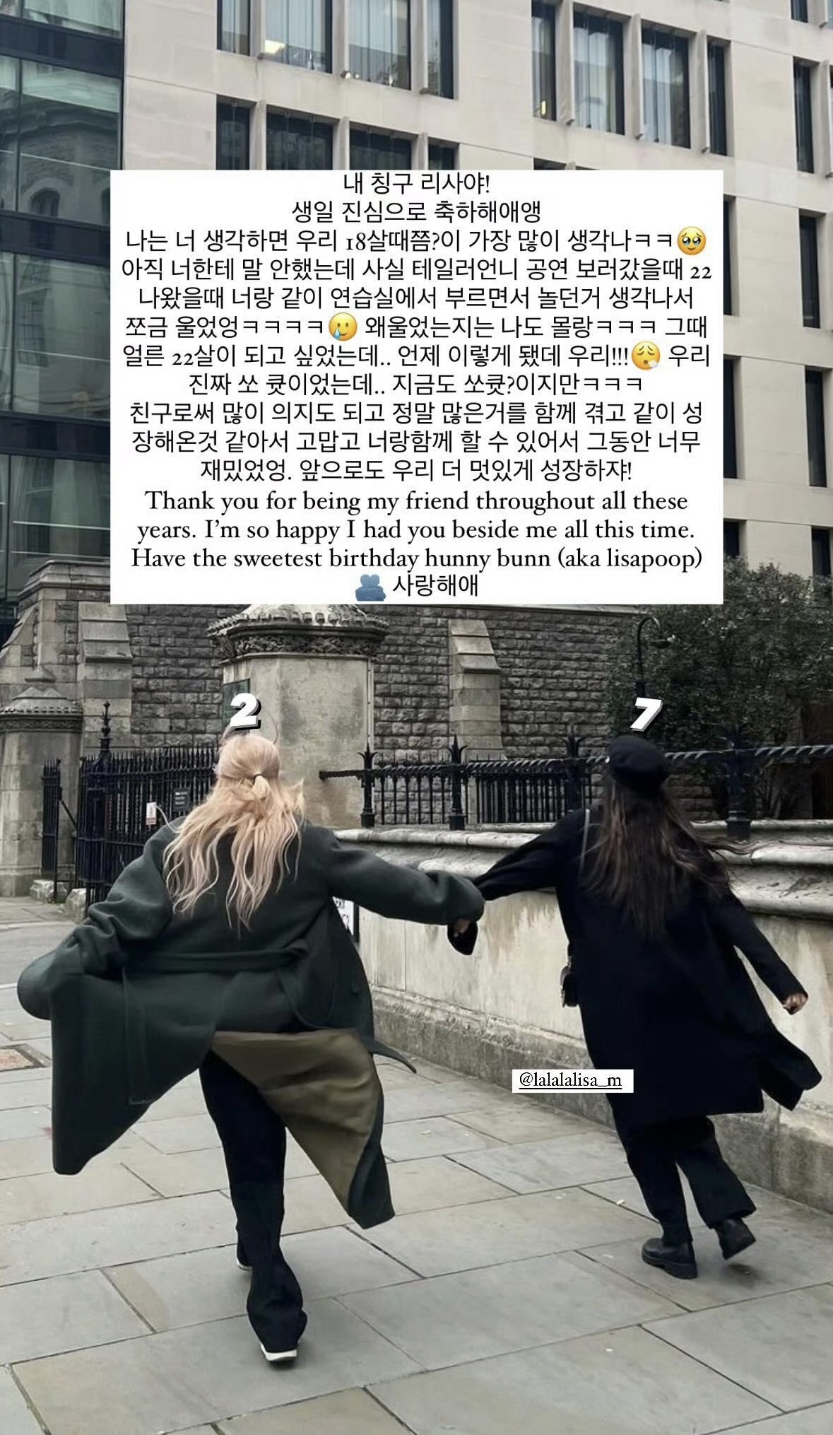 Rosé随后上传合照写长文送祝福:“想起你就想到我们18岁的时候?我还没告诉过你,当泰莱在演唱会演唱《22》时,我回想起我们一起在练习室唱歌玩耍的时光,所以哭了一下哈哈哈。”;她不禁感叹:“怎么这么快,我们就到这年纪了!我们真的很棒…虽然现在也很棒哈哈哈。”