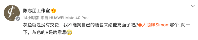 另外,有网友发现陈志朋工作室微博头像是灰V的标志,表示自己从来没见过这个颜色,工作室随后发声明称“灰色是没有交费,我不能自掏腰包来给他充面子吧”。