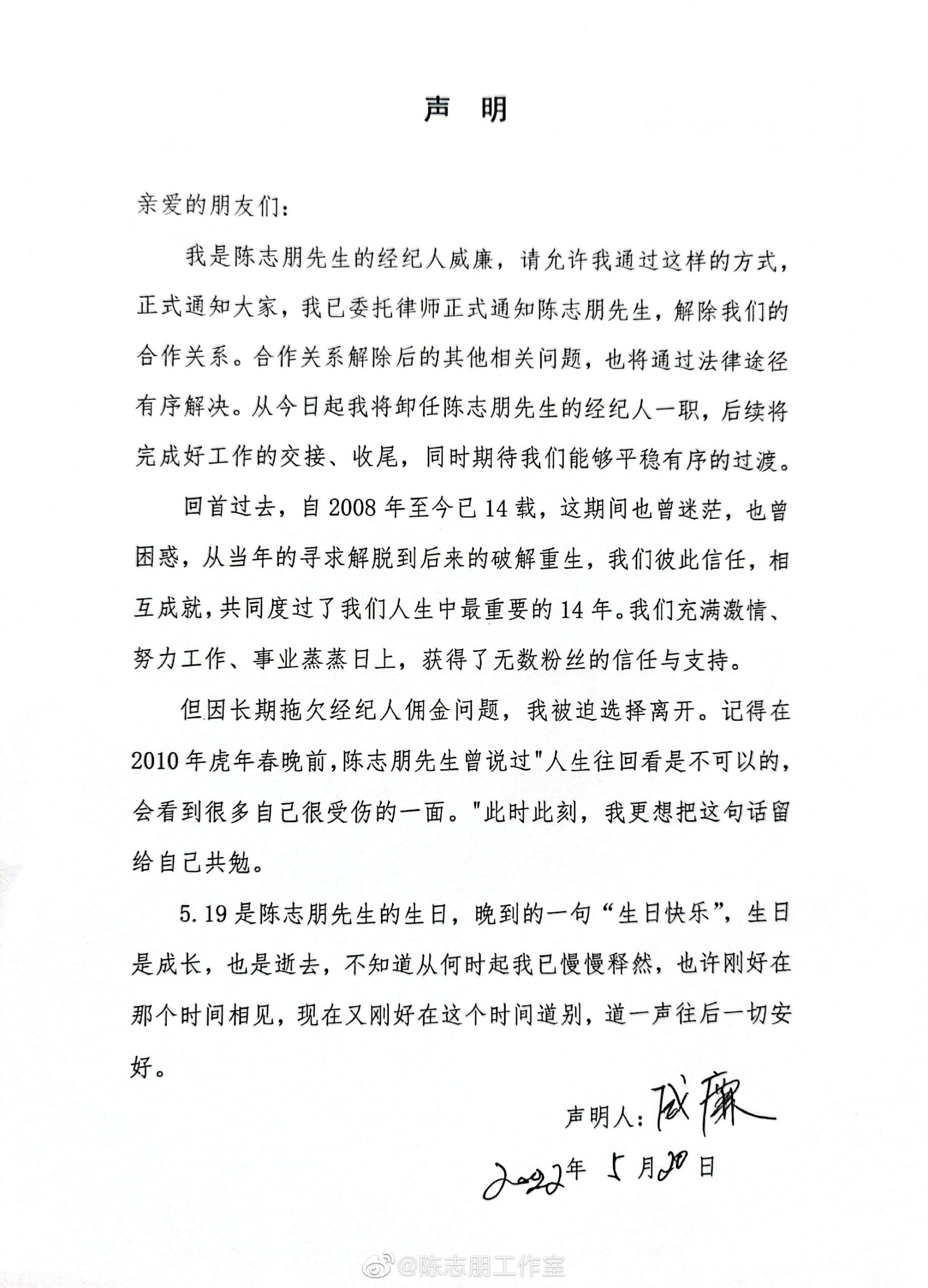 ”从今日起我将卸任陈志朋先生的经纪人一职,后续将完成好工作的交接、收尾。“