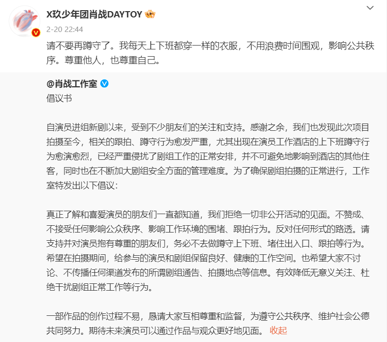 肖战最近拍摄新剧《藏海传》,但代拍、追星族太猖狂,每天蹲在剧组及他下榻的酒店,逼得肖战为防偷拍,每天都穿一模一样的衣服上下班,他还亲自发文,苦求大家不要再浪费时间苦守围观。