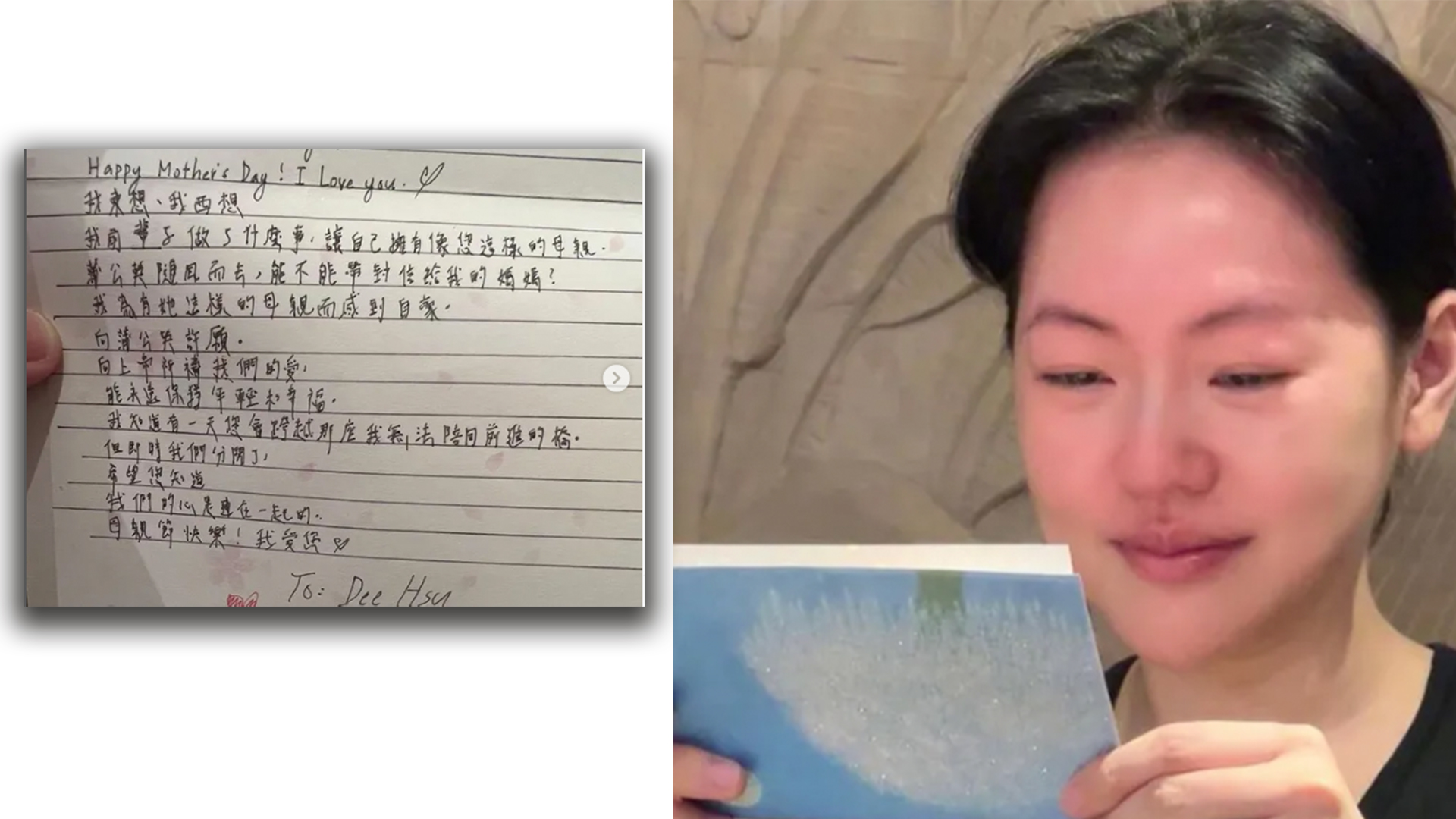 小S接着透露大女儿剪了影片、二女儿煮了母亲节大餐、三女儿DIY手链,她还收到了一封感人至深的信,上面写着“我为有她这样的母亲而感到自豪。向蒲公英许愿。向上帝祈祷我们的爱。能永远保持年轻和幸福。我知道有一天您会跨越那座我无法陪同前进的桥。但即使我们分开了,希望您知道我们的心是连在一起的。母亲节快乐!我爱您!”