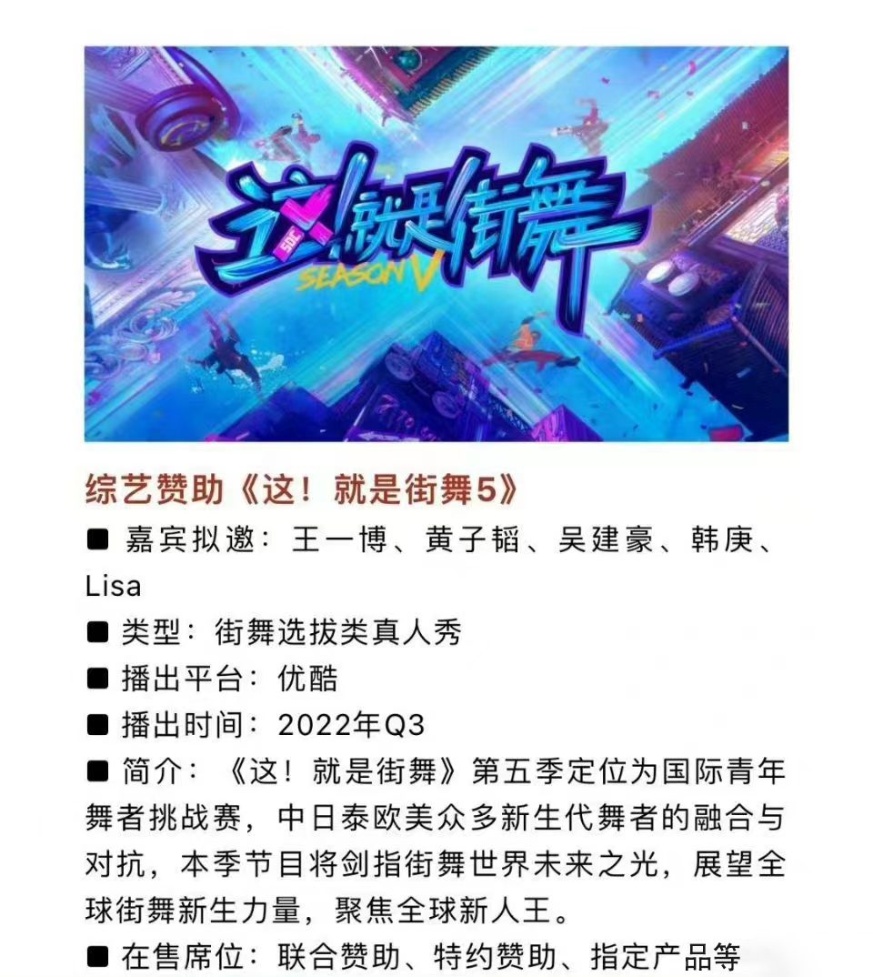 《这街》第五季将会如期归来,根据这档街舞选拔真人秀的招商资料,《街5》会在第三季播放,而拟邀的名单中,包括王一博、黄子韬、吴建豪、韩庚及首次将邀请的Lisa。