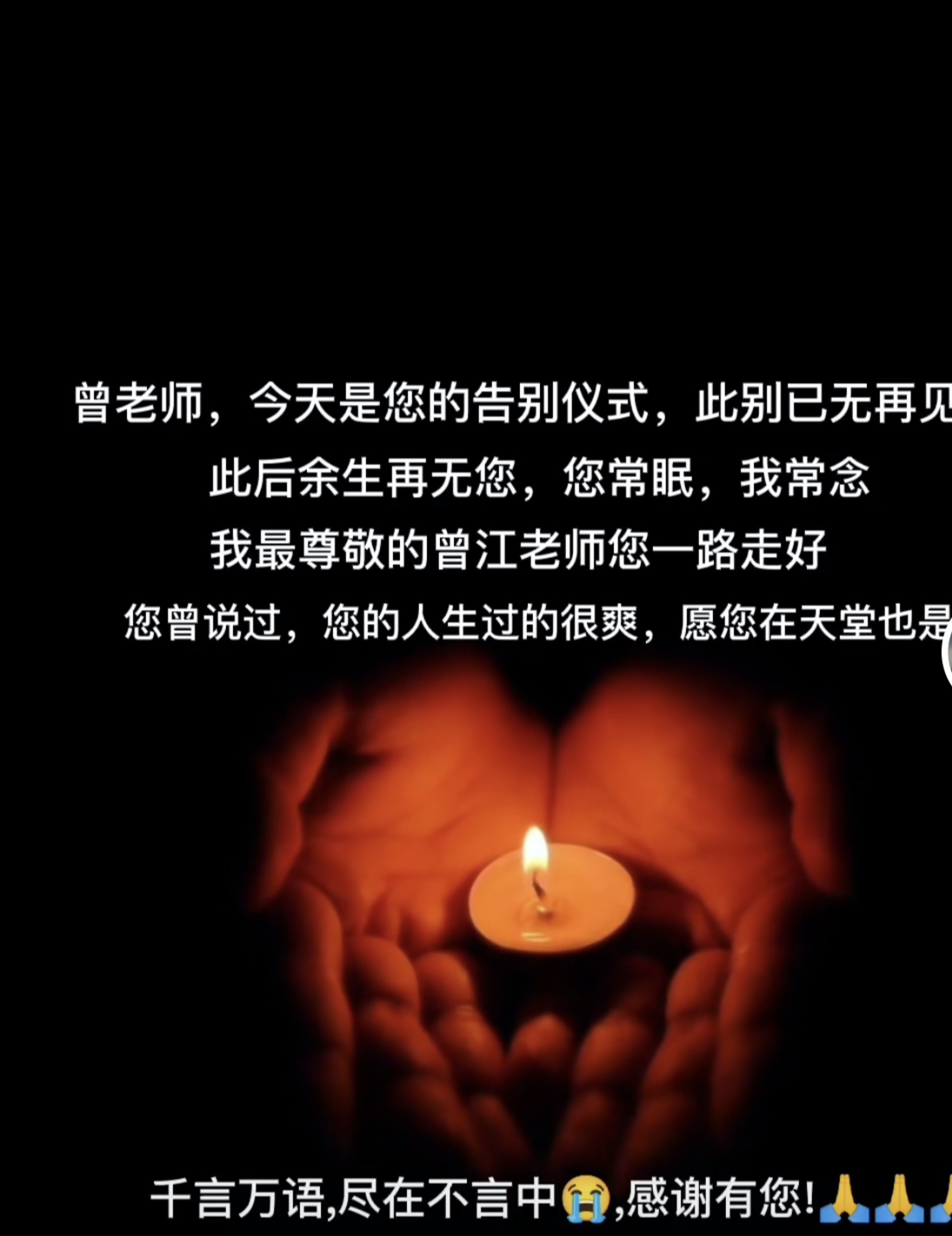 曾江工作室发布一则帖子,写道:“曾老师,今天是你的告别仪式,此别已无再见,此后余生再无您,您常眠,我常念。我最尊敬的曾江老师您一路好走,您曾说过人生过得很爽,愿您在天堂也是,千言万语,尽在不言中。”