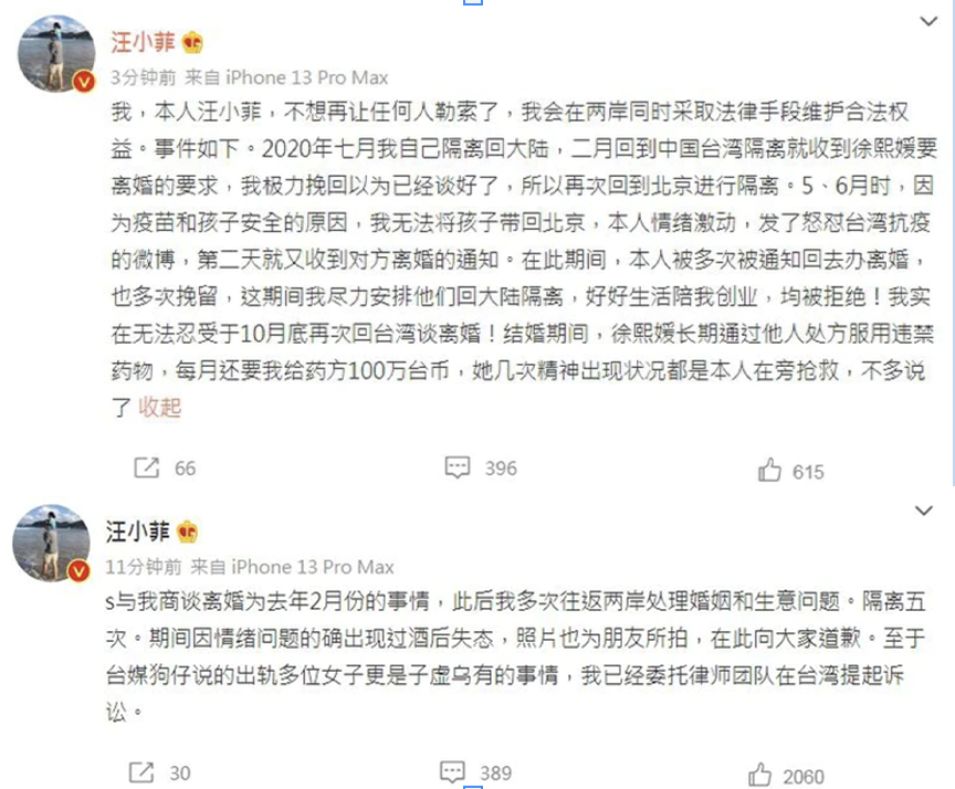 他自认实在无法忍受,于当年10月底再次回台湾谈离婚,并大爆:“结婚期间,徐熙媛长期通过他人处方服用违禁药物,每月还要我给药方100万台币,她几次精神出现状况都是本人在旁抢救,不多说了。”