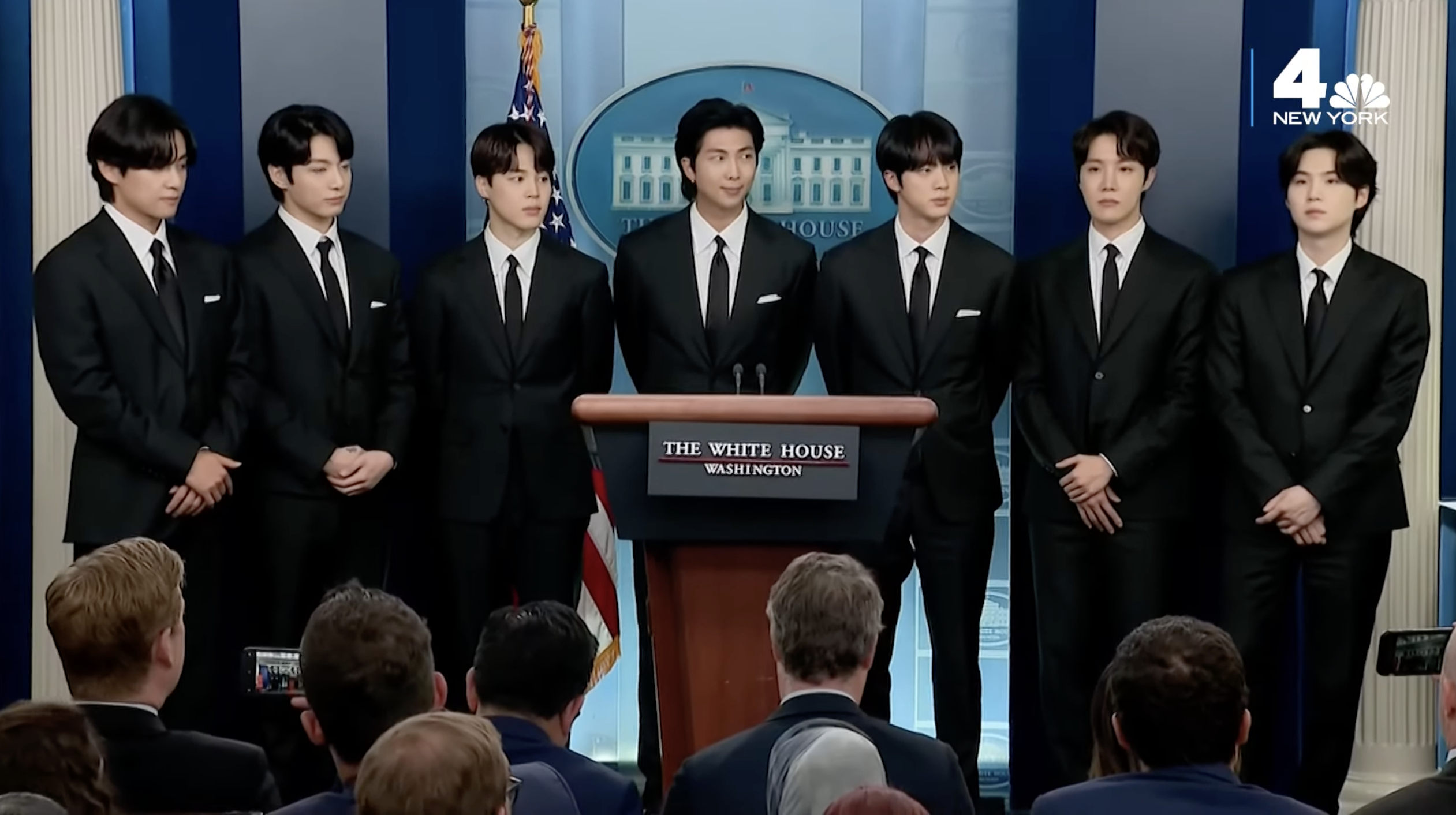 BTS队长RM金南俊说,“嗨,我们是BTS,今天很荣幸受邀到白宫商讨反亚裔仇恨犯罪,亚裔相容和多样性”;金硕珍说,今天是亚裔美国人及夏威夷/太平洋岛屿原住民遗产月的最后一天,BTS与他们站在一起。