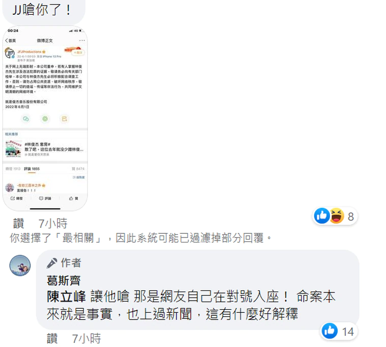 底下有网友留言说:“JJ呛你了!”而葛斯齐不以为然回应:“让他呛,那是网友自己在对号入座!命案本来就是事实,也上过新闻,这有什么好解释。”