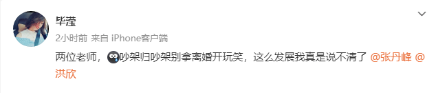 此外,曾与张丹峰有过“出轨传闻”的前经纪人毕滢,也在两人发文后,在凌晨发文对两人离婚宣言表示:“两位老师,吵架归吵架别拿离婚开玩笑,这么发展我真是说不清了。”