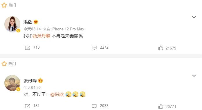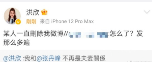 有眼尖网友发现,洪欣从半夜2时许开始,重覆发了3次离婚宣言,面对外界好奇原因,她一度回应“某人一直删我微博”。到了凌晨4时30分,张丹峰终于松口证实婚变,面对网友质疑“所以是删不过来了才回应的吗?”他留言反击“你哪只眼睛看到我删了。”