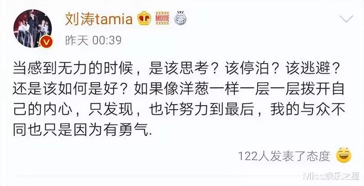 刘涛写道:“当感到无力的时候,是该思考?该停泊,该逃避?还是该如何是好?如果像洋葱一样一层一层拨开自己的内心,只发现,也许努力到最后,我的与众不同也只是因为有勇气。”