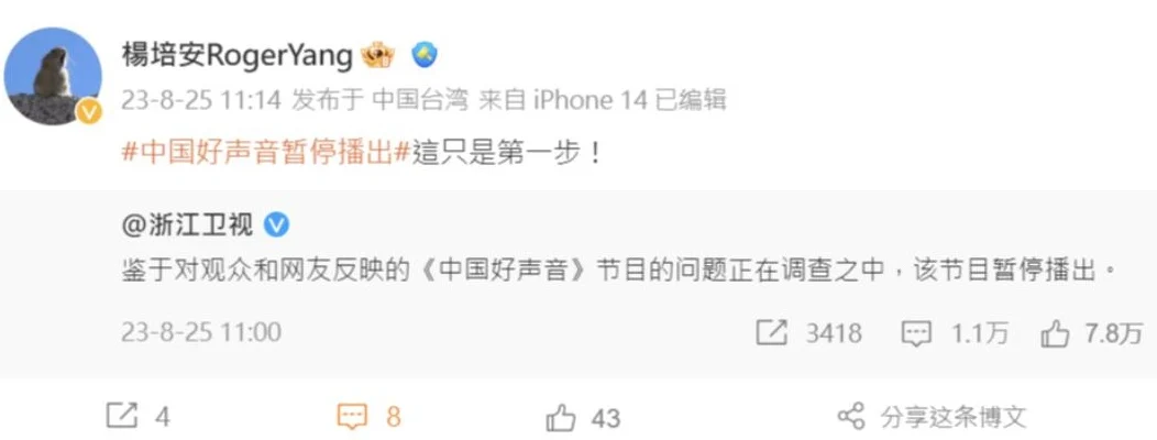 此外,相当关注李玟事件铁肺唱将杨培安,连日来呼吁中国官媒重视调查,他在得知《好声音》停播后,也第一时间在微博振奋表示:“这只是第一步!”网民也开心回应:“暂停不是最终目的,而是调查出来食物链”、“大快人心”、“应该枪毙这样的不良节目。害人命丧! !怒不可言!”