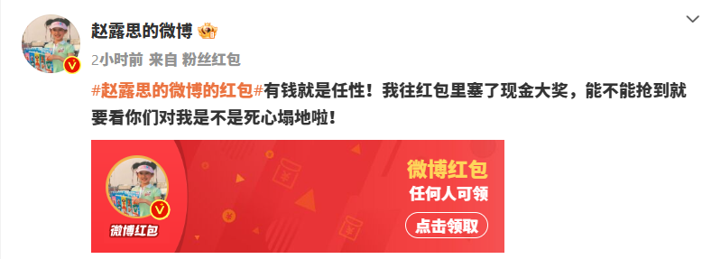 赵露思在微博发红包,配文开玩笑写道:“有钱就是任性!我往红包里塞了现金大奖,能不能抢到就要看你们对我是不是死心塌地啦!”