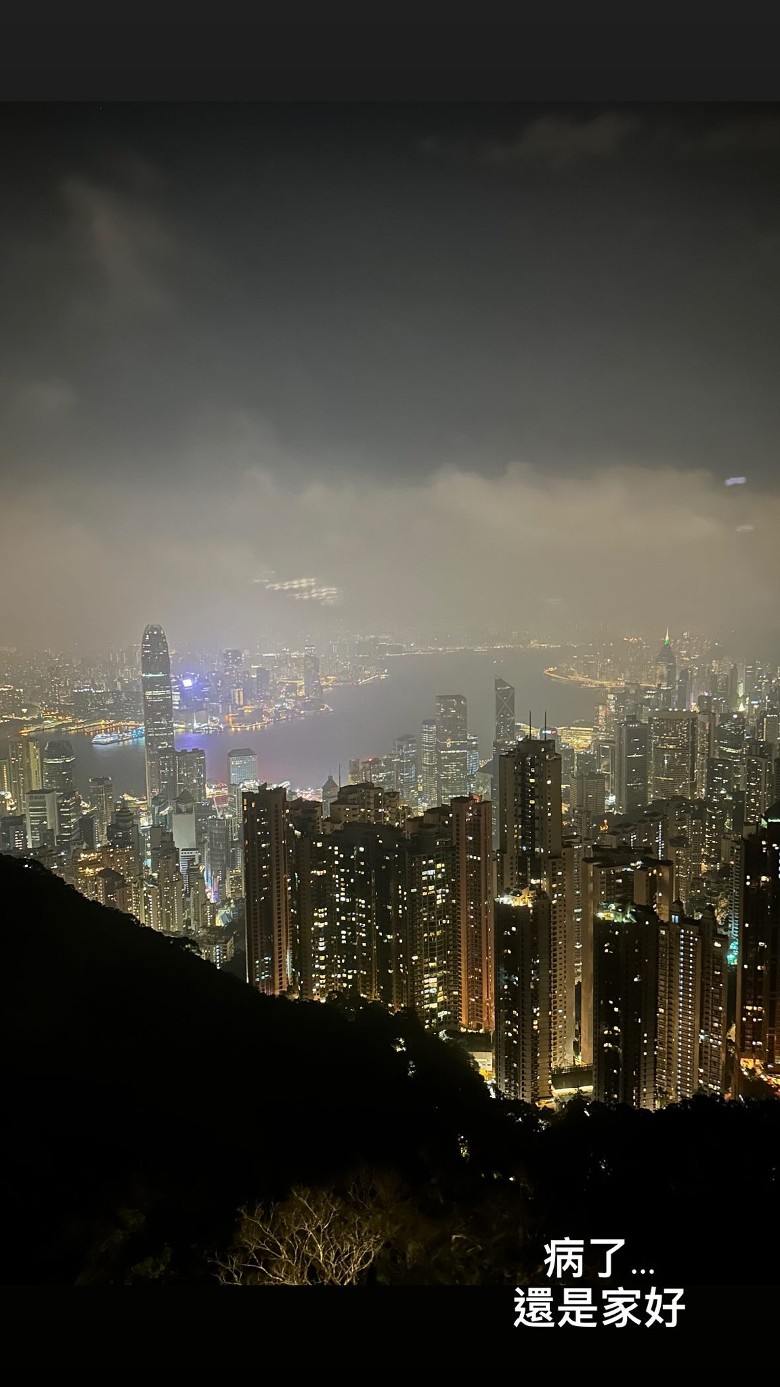 林夏薇分享了两张照片,展示了她目前的状况。其中一张是她在山上俯瞰香港夜景的照片,附文写道:“病了…还是家好。”
