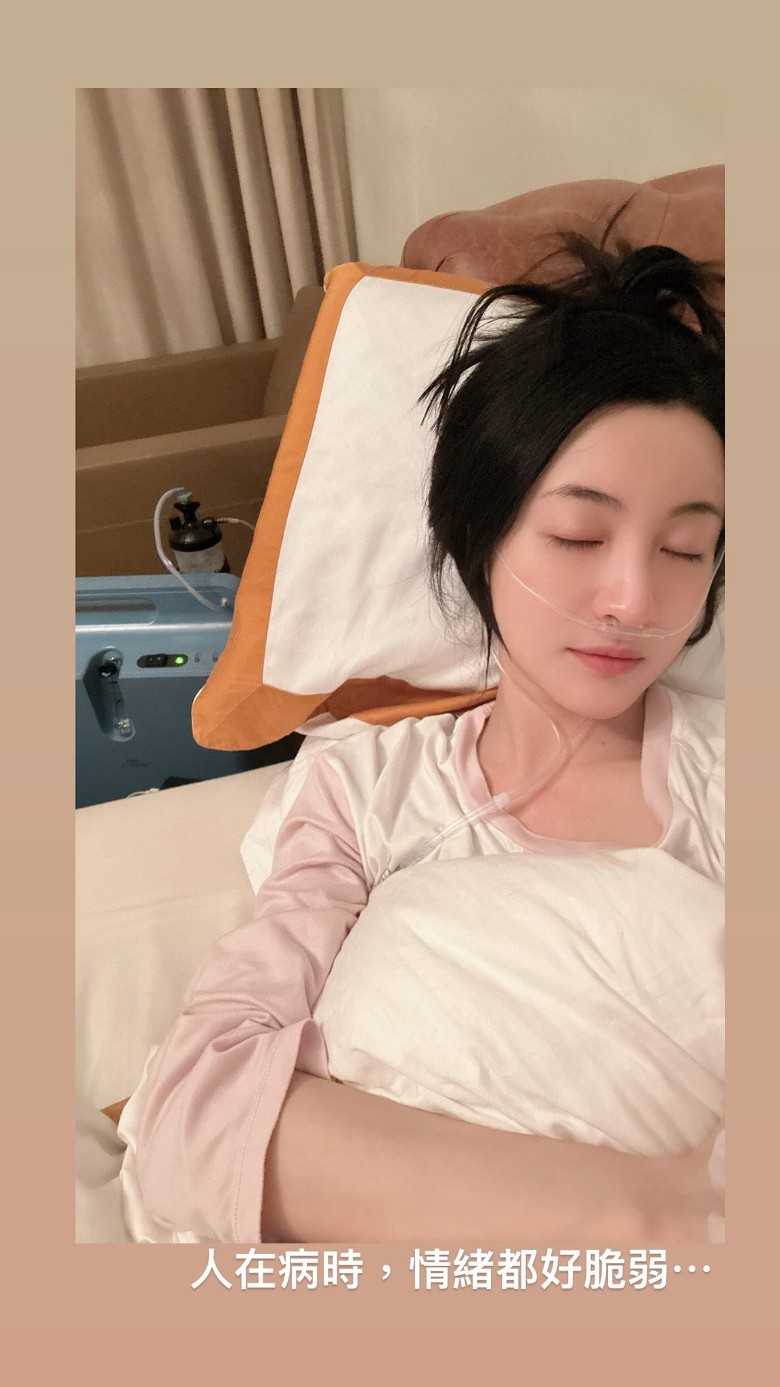 另一张照片显示她躺在病床上,鼻插喉管,她一脸病容,面色惨白,床边摆放着许多医疗设备,显示她正在医院接受治疗,情况令人担忧。
