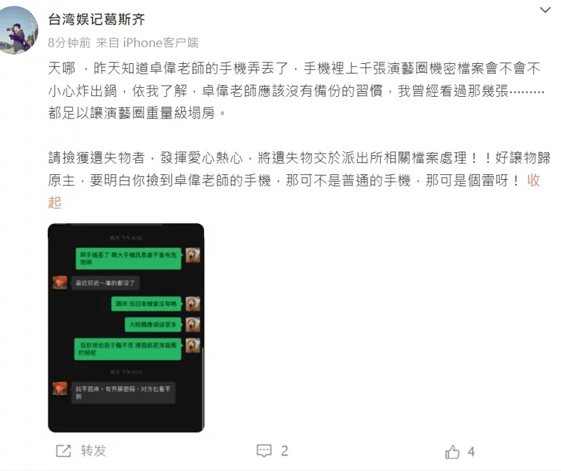 葛斯齐在微博发文,晒出和卓伟的对话内容,指卓伟苦恼手机搞丢,近一年资料恐拿不回来,好在有设置密码,可以防有心人士从中作祟。