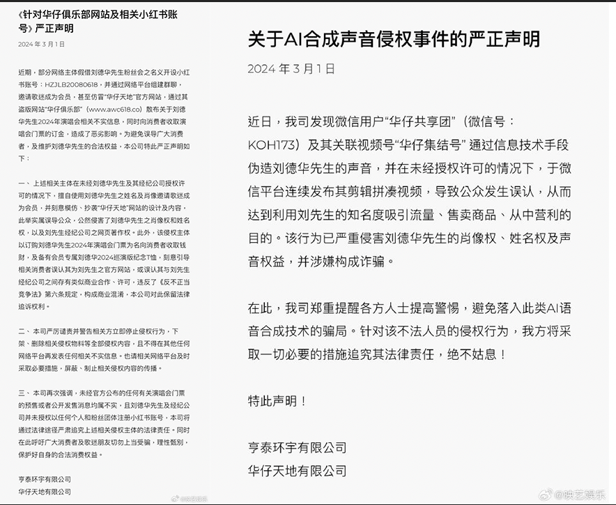 香港天王刘德华所属公司,就“小红书假粉丝俱乐部收演唱会订金”及“AI合成声音侵权”连发两则声明,促请各界注意免被误导!