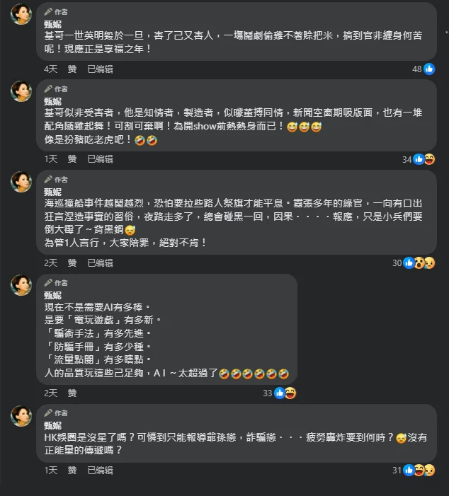 一向爱把留言区当“讨论区”使用的甄妮,连日在帖文下“自言自语”,内容相当直白,她先是:“基哥一世英明毁于一旦,害己又害人,一场闹剧偷鸡不着蚀把米,搞到官非缠身何苦呢!现应正是享福之年!”。