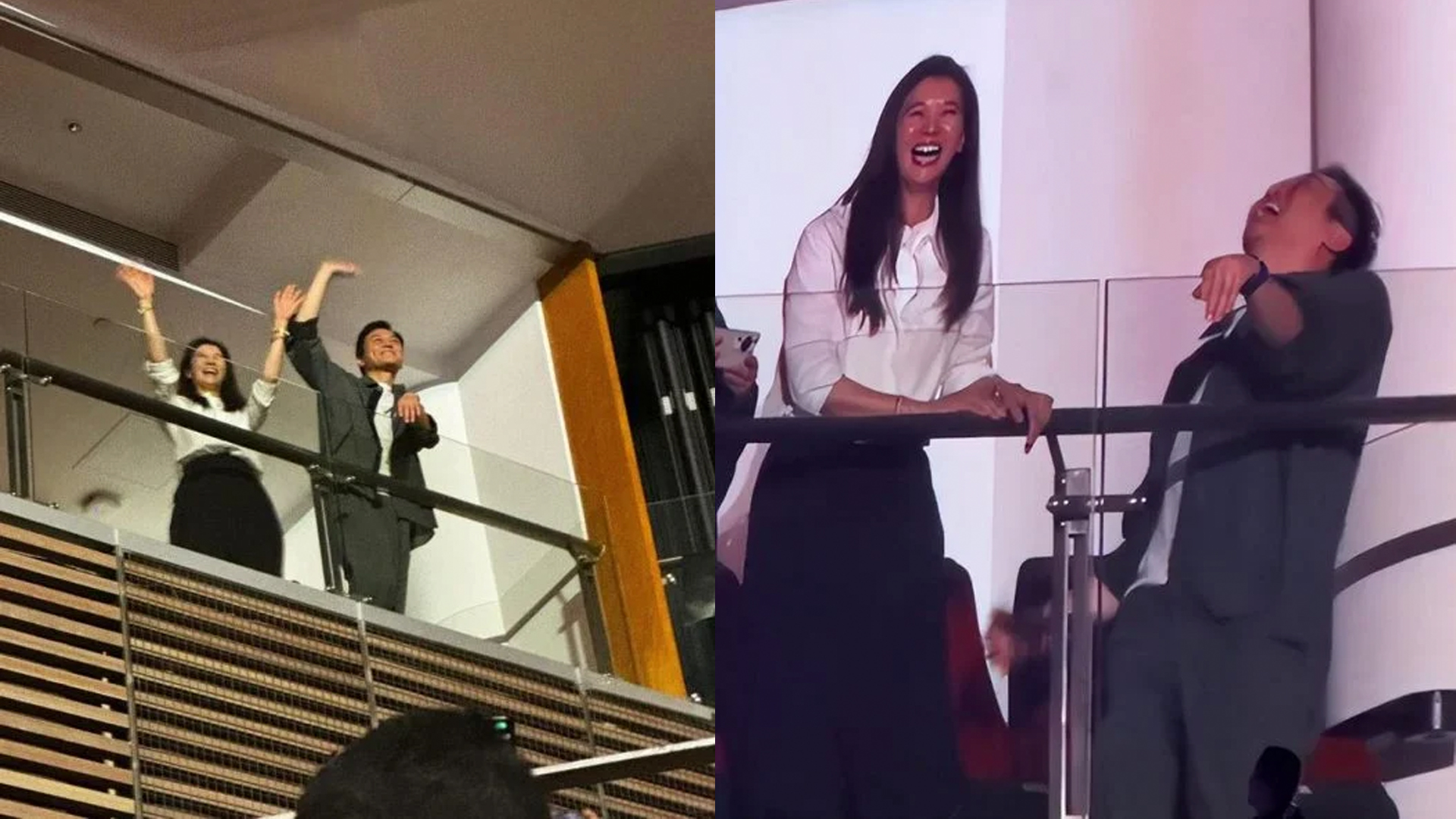 张智霖和袁咏仪当天都打扮休闲,不断向镜头挥手。之后不知道林志炫在舞台上说了什么,张智霖和袁咏仪笑得开心,张智霖更是前俯后仰。两人现场还嘴对嘴接吻,甜蜜互动和深情拥吻成为现场亮点,在场歌迷尖叫连连,为之沸腾。