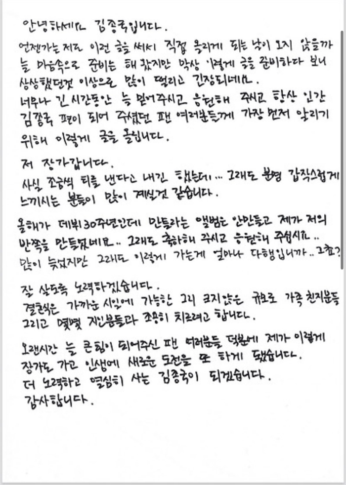 金钟国在信中写道:“其实我一直知道,总有一天要写下这样的文字,但真正动笔的这一刻,心情比想像中更加紧张与激动。我要结婚了!虽然来得有点晚,但能这样走向人生下一阶段,我真的觉得很幸运。”