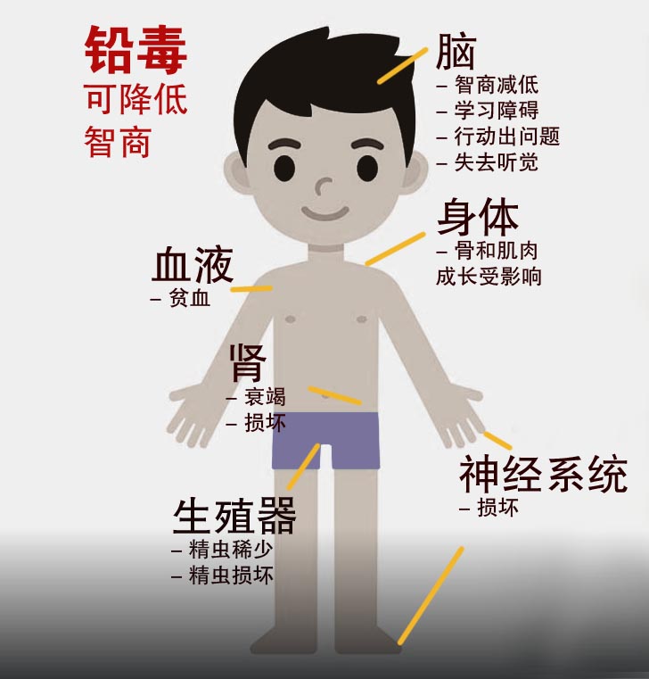 儿童身体吸收铅的速度远高于成人,且免疫系统尚未健全。一旦中毒,即便是低浓度也可能影响认知发展、听力与注意力,更严重者会出现神经受损或行为问题。