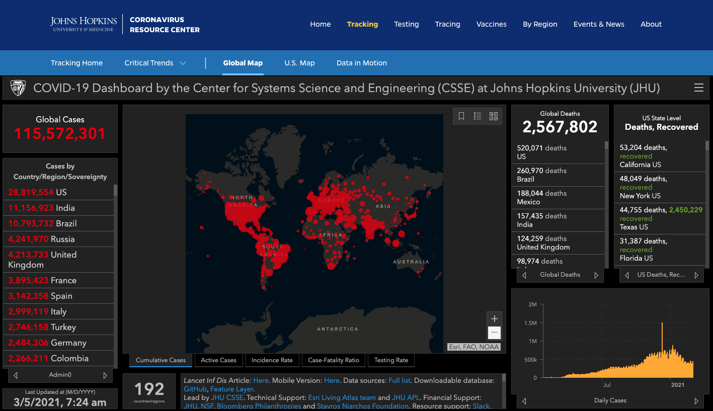 ➡️疫情肆虐全球至少 #192国/地区,截至今早8am,美国约翰斯·霍普金斯大学实时统计:全球累计确诊病例115,572,301例,累计死亡2,567,802例。
