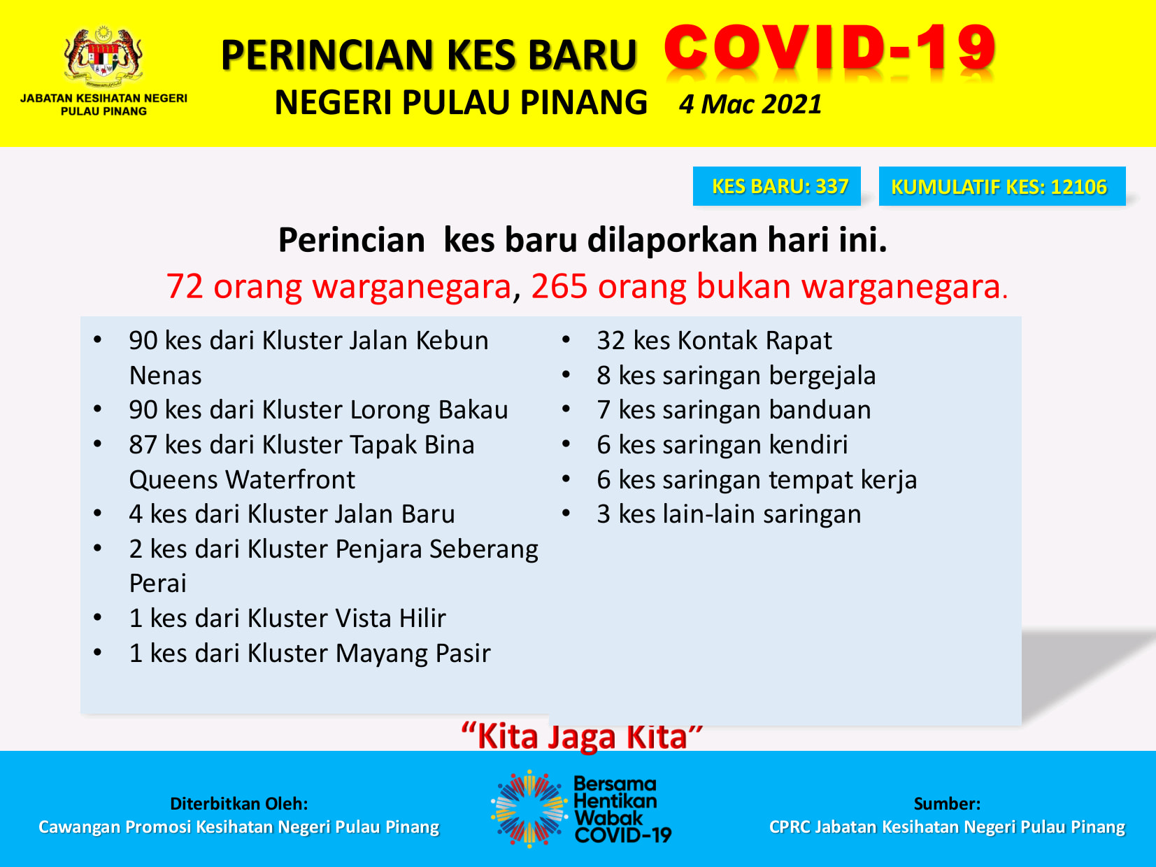 ➡️槟州突增337宗,主要源自建筑工地及工厂感染群,包括其中90宗源自大山脚感染群、90宗源自Lorong Bakau感染群、87宗源自Queens Waterfront建筑工地感染群等。