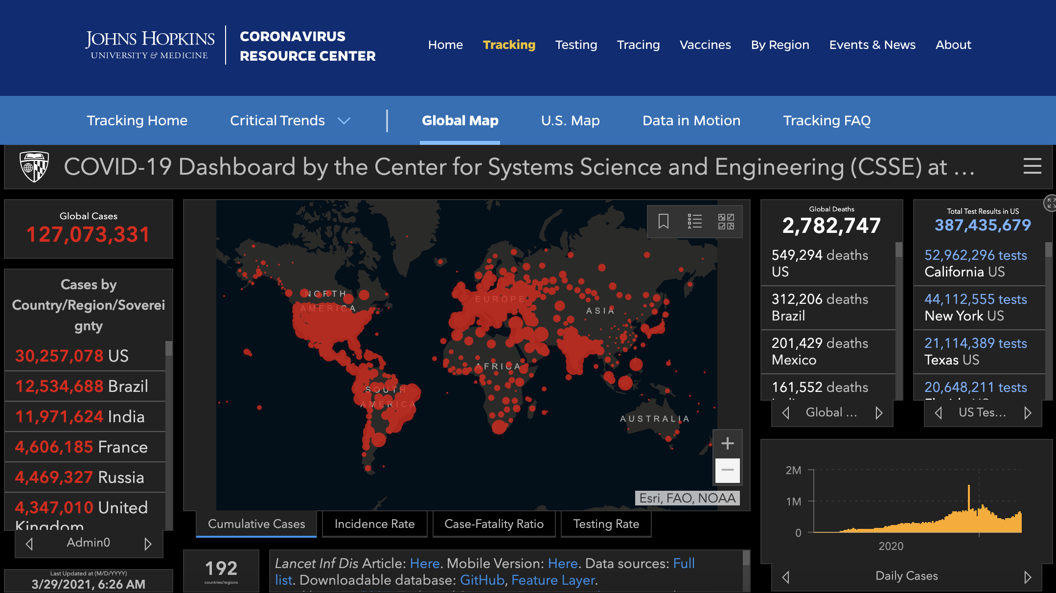 截至3月29日6.31am,疫情肆虐全球至少 #192国/地区,据美国约翰斯·霍普金斯大学实时统计:全球累计确诊病例1亿2707万3331例,累计死亡278万2747例。