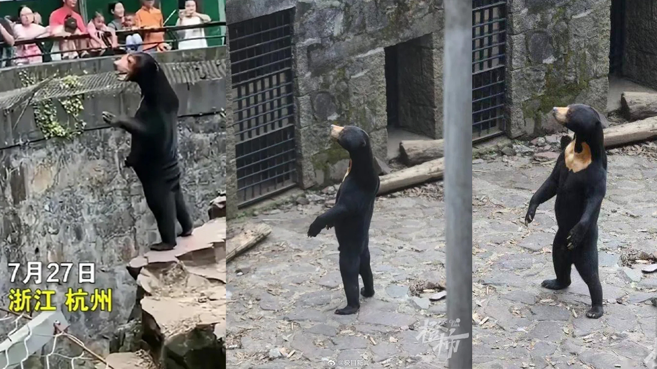 中国网友日前在杭州市动物园拍到园区里一头黑熊因为太过“人模人样”的站立,以致被不少人质疑“是人扮的”,而热烈讨论到上了热搜。