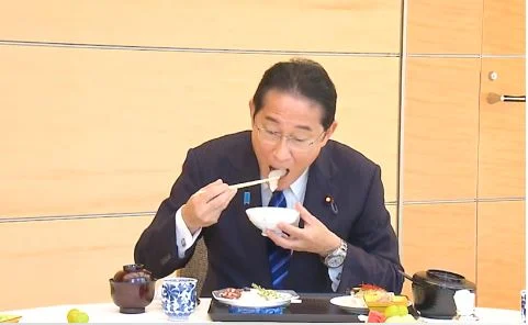 岸田率领经济产业部长西村康稔、财务部长铃木俊一以及儿童政策担当部长小仓将信,一同在首相官邸吃午餐。菜单由福岛特产所组成,特别是在福岛县海域捕捞到的比目鱼、花鲈以及章鱼的生鱼片,借此再度重申福岛水产的安全性。