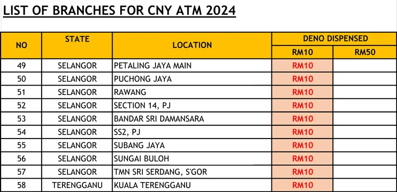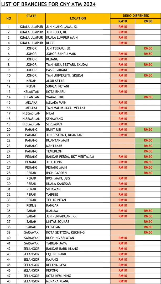 以下为马银行在官网,附上全国各地58个提供新纸钞的自动提款机位置: