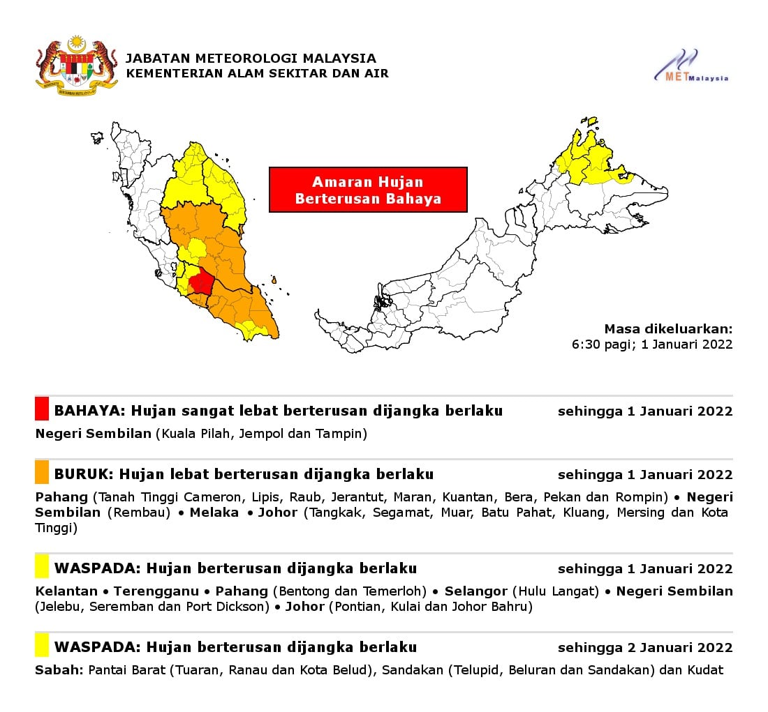 根据气象局今早6时30分更新的资料,当局向森美兰瓜拉庇劳、淡边和仁保地区发布红色(危险)降雨警报,预计相关地区今日会有连绵大雨。