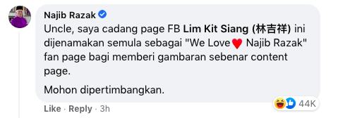 这则贴文再度“吸引”纳吉留言:“Uncle,我建议林吉祥脸书专页该名为“We Love Najib Razak”(我们爱纳吉)粉丝专页,这更能显示有关页面的实况,请考虑。“