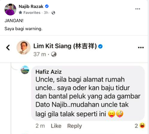 林吉祥近日对纳吉展开多番追击,纳吉也不甘示弱,频频到其脸书专页留言调侃反击。