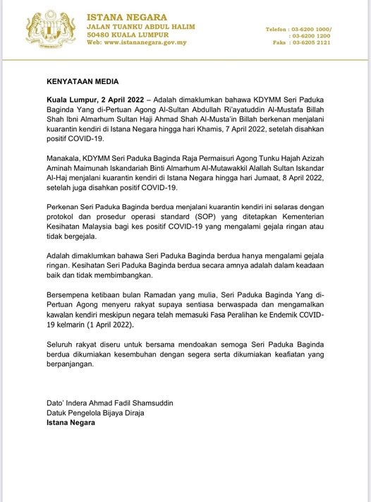 国家皇宫总管阿末法迪尔发文告说,元首及元首后分别在皇宫自我隔离至本月7日及8日。