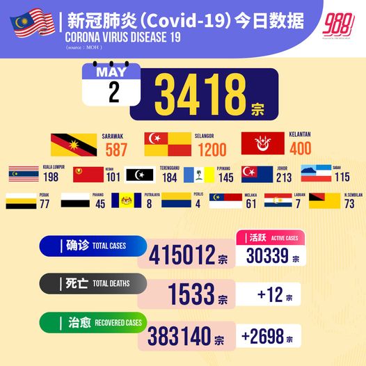卫生部通报,截至2日12pm,我国新增 #3418例,累计病例至今 # 415,012 宗,新增12死累计#1533死。