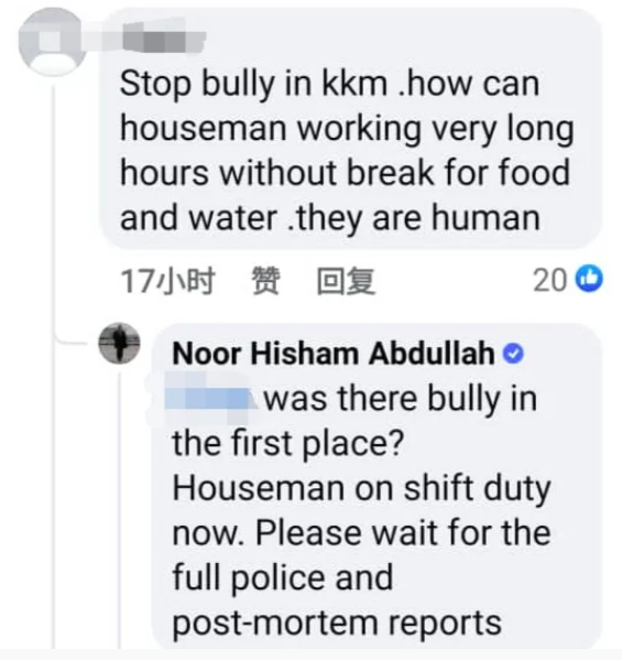 一名网民在诺希山的面子书贴子留言指,需要停止卫生部内部的霸凌,更称怎么可以让实习医生长时间工作,没有休息和用餐时间。