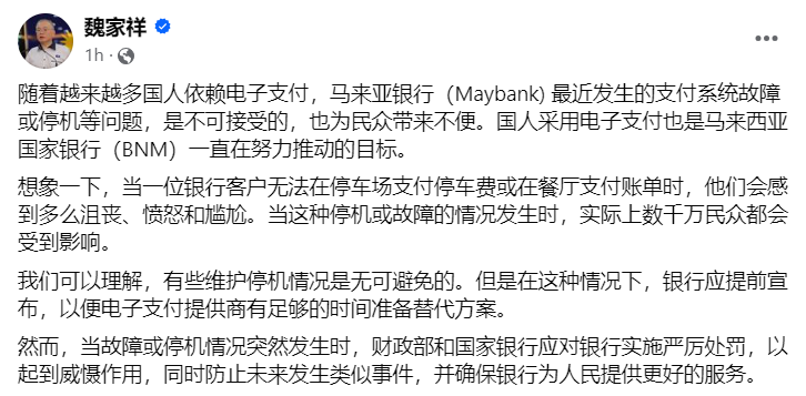 他在脸书发文说,随着越来越多国人依赖电子支付,马来亚银行最近发生的支付系统故障或停机等问题,是不可接受的,也为民众带来不便。