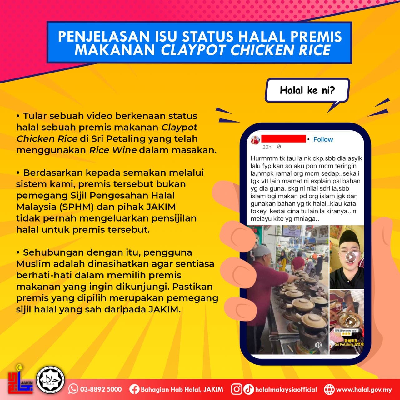 大马伊斯兰发展局(JAKIM)证实,近日在网络爆红的一家由穆斯林夫妇经营的瓦煲鸡饭没有清真食品认证!