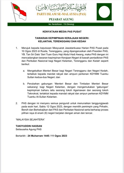 伊斯兰党总秘书达基尤丁宣布,伊党维持登嘉楼和吉打的大臣人选,至于吉兰丹的大臣和副大臣组合将有变动。