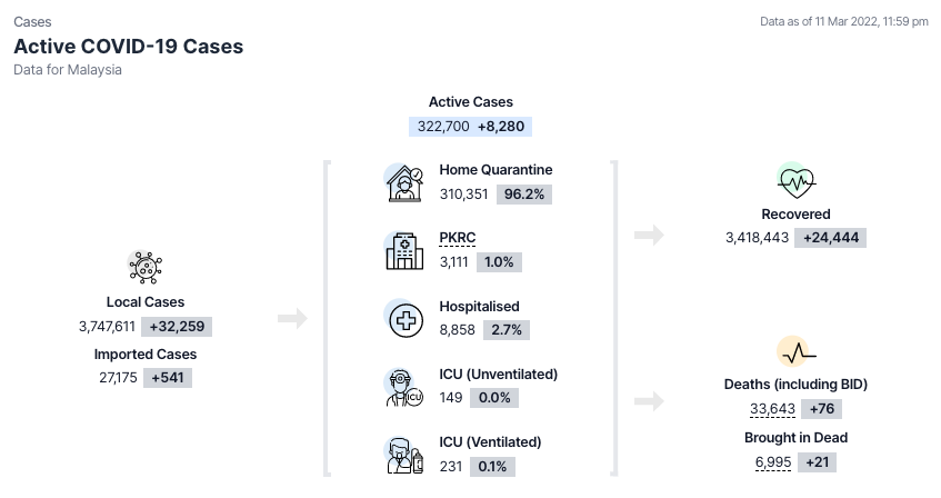 卫生部COVIDNOW网站通报,截至11日11.59pm,我国新增 #32,800宗,累计病例至今 #3,774,786宗。