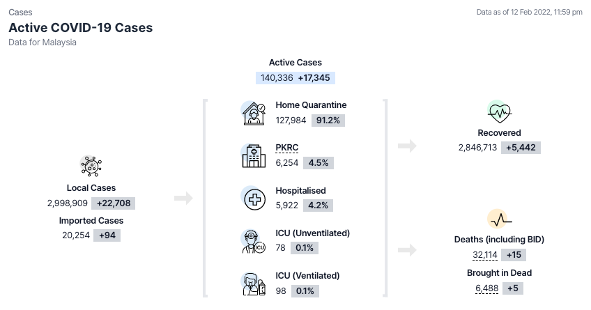 卫生部COVIDNOW网站深夜11时59分通报,2月12日新增死亡病例(包括积压病例)15宗,累计达32,114宗。
