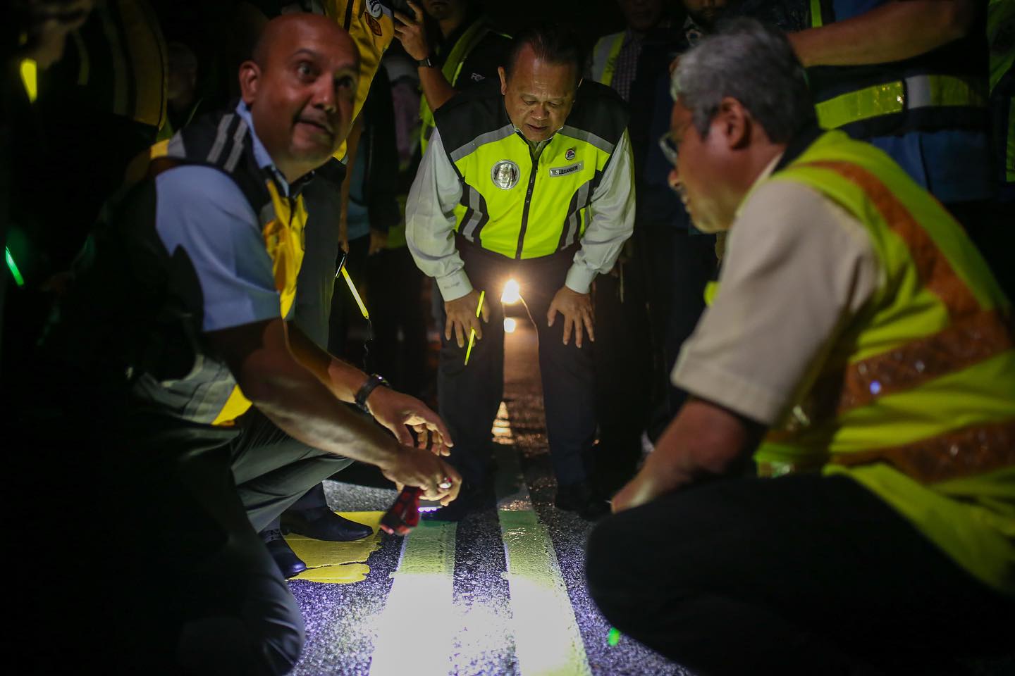 乌冷公共工程局为交通标线涂上“夜光”色,这有助提升夜间驾驶安全,工程部长亚历山大昨晚实地视察“夜光”道路效果。