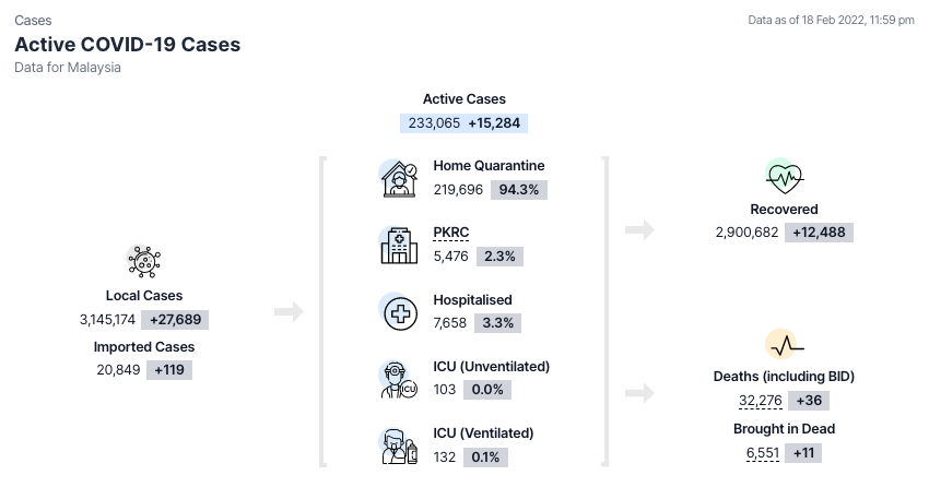 卫生部COVIDNOW网站深夜11时59分通报,2月18日新增 # 27,808宗,累计病例至今 #3,166,023宗。