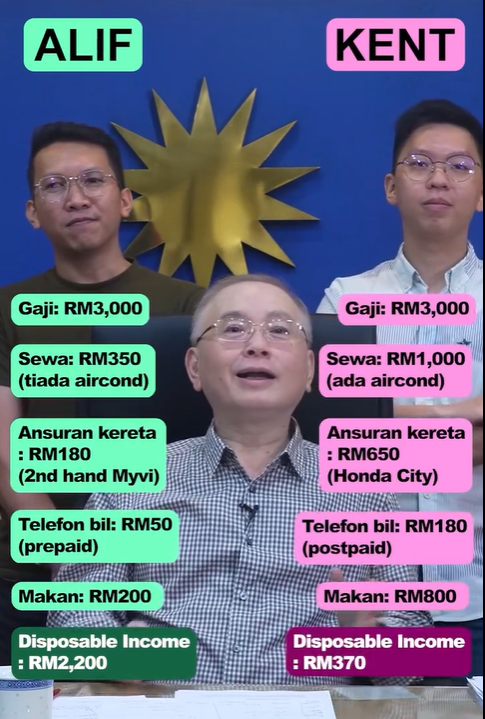 他在社媒上载视频,以两名年轻人为例子,Alif和Kent的薪水一样,但Alif节俭,Kent则较挥霍,因此Alif的可支配收入更多。
