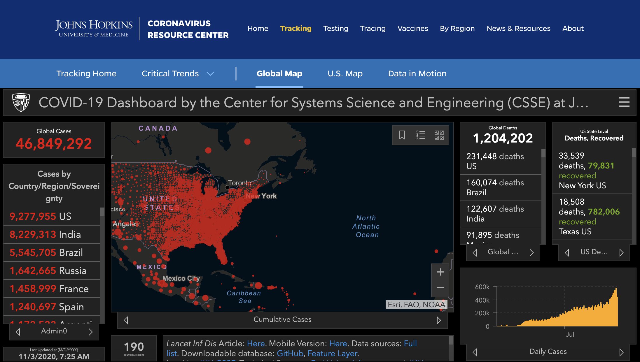 ➡️疫情肆虐全球至少 #188国/地区,截至今早7.25am,美国约翰斯·霍普金斯大学实时统计:全球累计确诊病例46,849,29例,累计死亡1,204,202例。