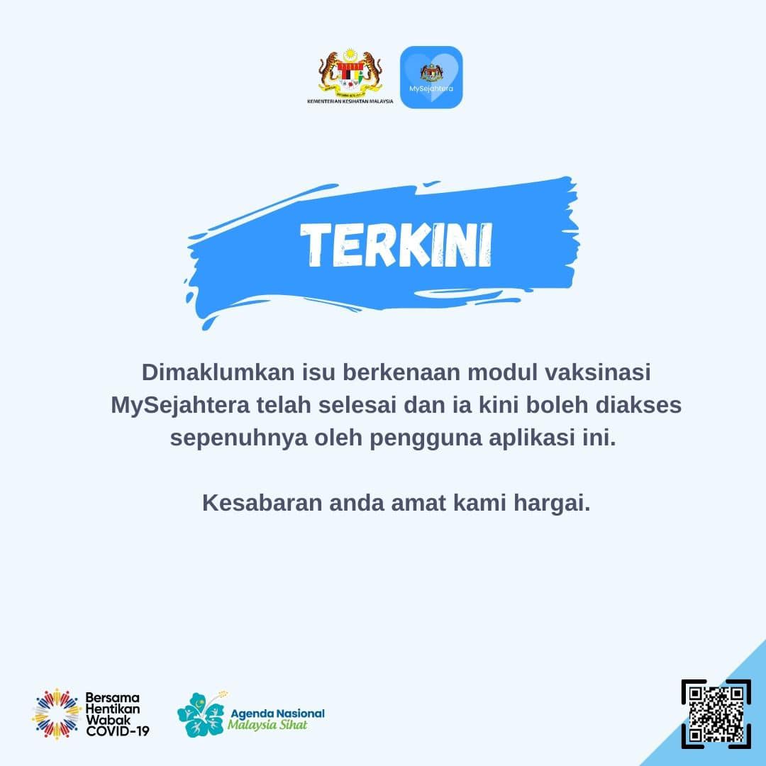 MySejahtera昨午也发文证实,基于技术问题,MySejahtera暂时无法运作,并表示将会尽快修复;到了昨晚,MySejahtera再度发文指问题已经解决。